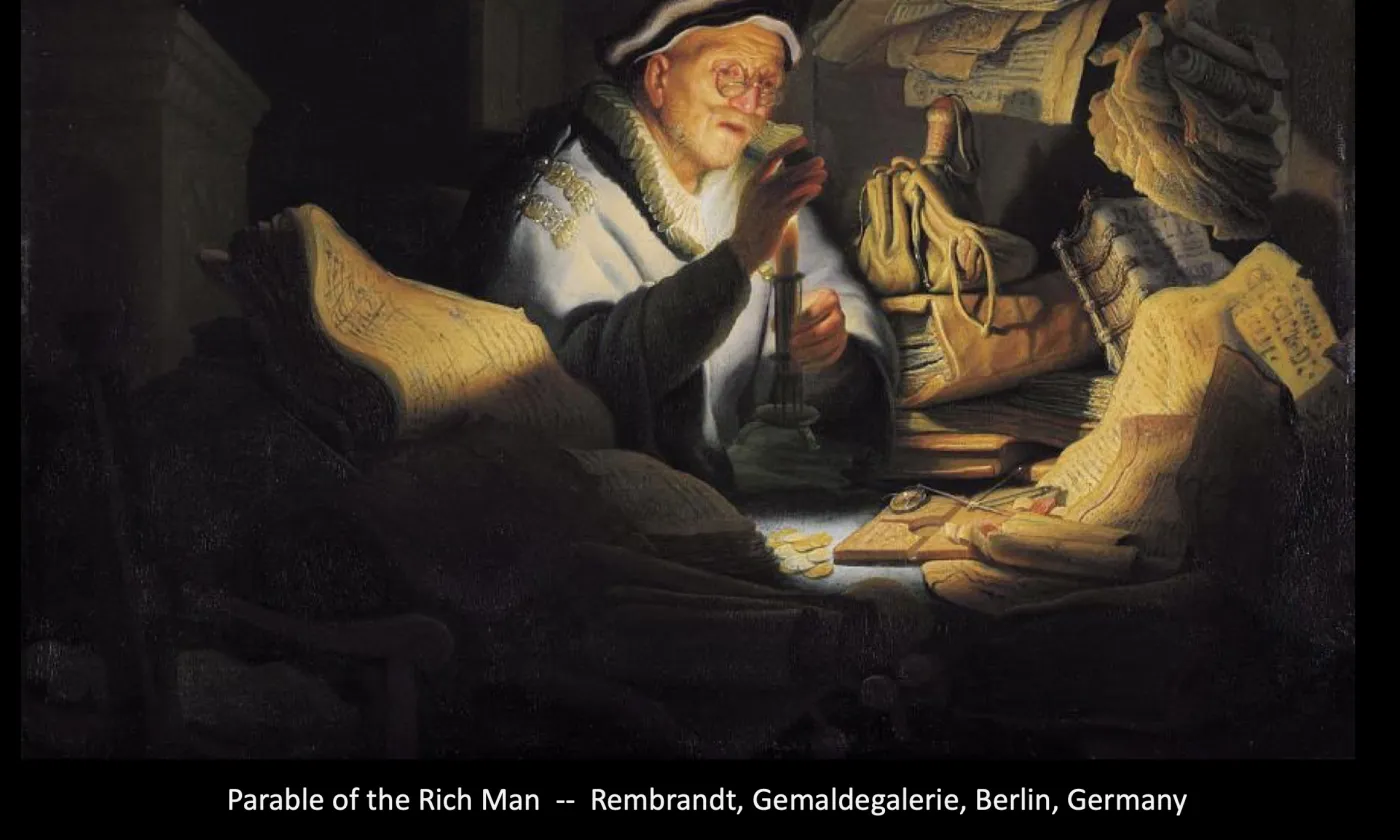 Y-a-t-il un problème avec cela ? Certainement pas. Ce n'est que dans la section suivante que le problème apparait. Regardant sa montagne de céréales l'homme se demande ce qu'il va en faire: « Que devrais-je faire ? Car je n'ai plus de place pour stocker toute ma récolte. Je vais abattre ma grange et en construire une plus grande et j'y entreposerai tout mon grain et tous mes biens.