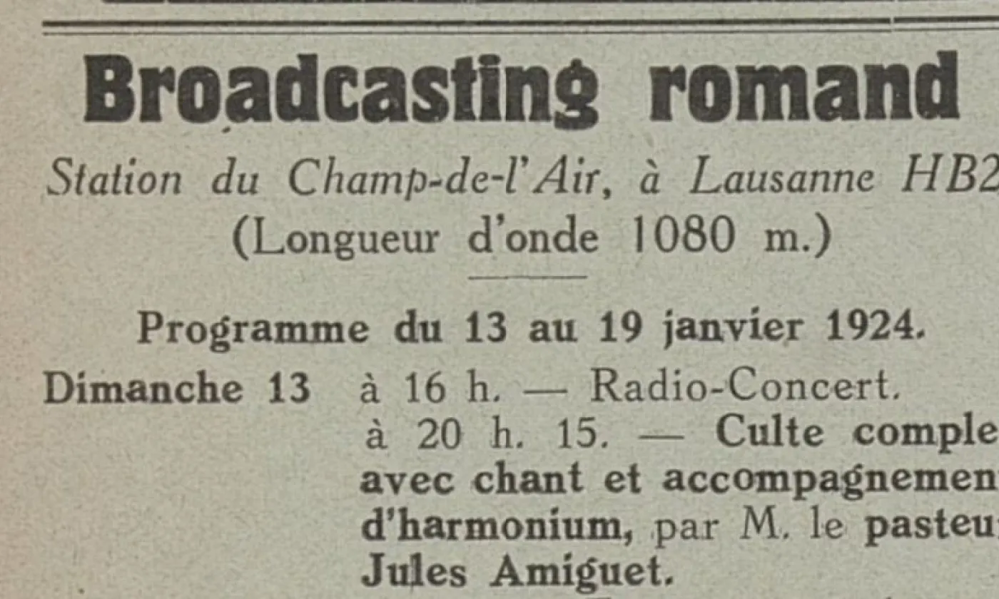 Cette incursion de l’Évangile à la radio se renouvelle début 1924 pour devenir régulière. Le culte donné le 13 janvier par le pasteur Jules Amiguet au Champ-de-l'Air – avec cette fois-ci chants et harmonium – signe la présence dominicale de l’Église au studio vaudois. A Genève, le culte entre définitivement au programme en 1925.