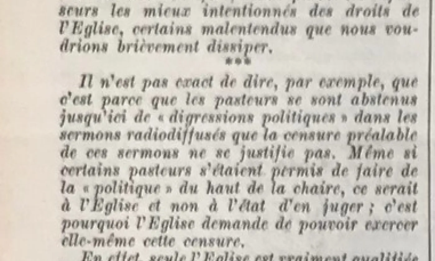 Les Églises n’échappent cependant pas à la censure généralisée durant la Seconde Guerre mondiale. Au studio de Berne, son directeur Kurt Schenker apparaît comme le plus grand pré-censeur des radios régionales. Il refuse à plusieurs reprises des manuscrits envoyés à l’avance par des pasteurs et supprime toute critique confessionnelle, déclaration de politique étrangère ou sur les réfugiés (Staub, 2009). Pour l'Église réformée, la liberté de prédication à la radio devient alors un problème majeur. Les organes des Églises s’opposent régulièrement au contrôle des manuscrits et rappellent leur droit à la liberté de proclamer l’Évangile, comme l’illustre cet article de La Vie protestante paru en 1939.