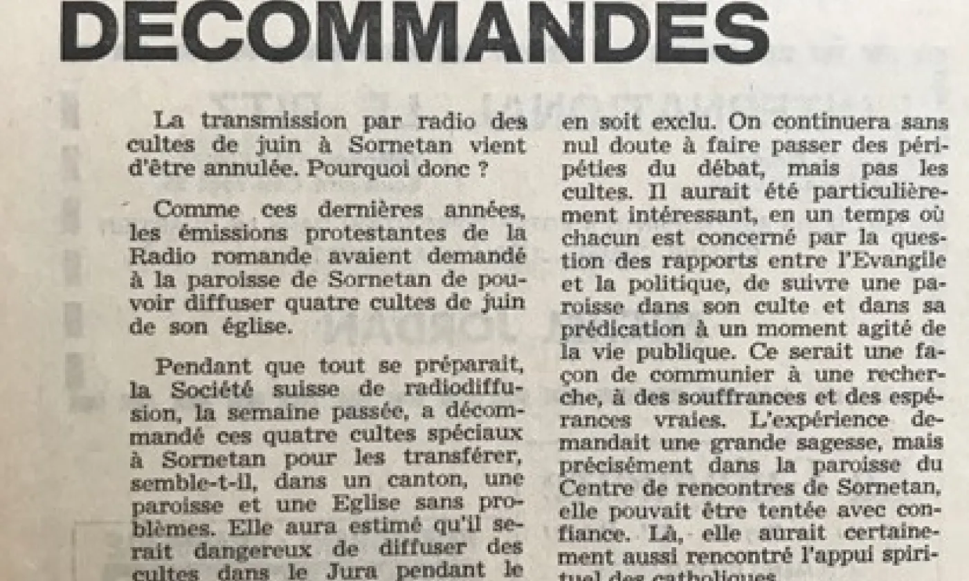 En mai 1974, alors que le peuple jurassien doit se prononcer sur son autonomie, le pasteur Philippe Roulet prépare quatre cultes pour une radiodiffusion prévue en direct de Sornetan, dans le Jura bernois. Ceux-ci sont toutefois immédiatement annulés par la SSR, suscitant l’incompréhension du pasteur concerné. Le paysage confessionnel jurassien reproduisant les clivages politiques sur la question jurassienne, la SSR rappelle la nécessité de présenter « de manière équilibrée les différents problèmes posés par le plébiscite ». Cette décision suscite l’incompréhension du pasteur. La Vie protestante relaie l’information de « ces cultes décommandés » sous la plume de Charles Biber, ainsi que la réponse de la Direction de la Radio Suisse Romand qui justifie « sa rigueur extrême […] par la gravité exceptionnelle de l’évènement ».