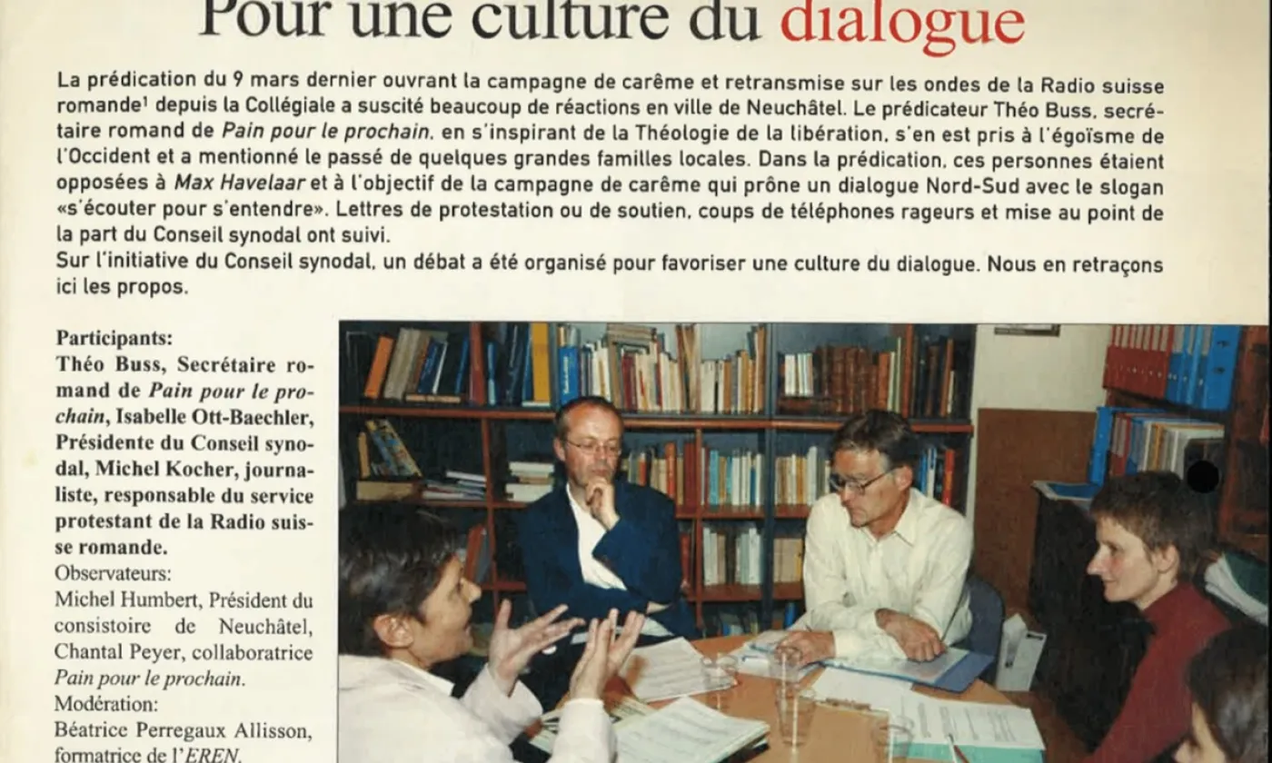 Les prédications laissent parfois percevoir les engagements et idées politiques des pasteurs qui les donnent. Durant les années 1970, Théo Buss, pasteur et journaliste engagé contre les injustices, officie dans le Locle dans le canton de Neuchâtel puis en Bolivie. Il dénonce dans ses cultes les dérives du néolibéralisme et la situation d’urgence écologique. Responsable du service d’information Tiers-Monde dans les années 1980 et Secrétaire romand de l’association Pain pour le prochain dans les années 2000, le service des Églises protestantes suisses pour le développement, il est particulièrement attentif aux mécanismes d’exploitation des pays du Sud (Meyer, 2021). Cette organisation soutient en effet plusieurs centaines de projets et programmes de développement dans plus de 60 pays d'Afrique, d'Asie et d'Amérique latine. Le 9 mars 2003, Théo Buss donne la prédication « Vivre le partage » qui est retransmise sur les ondes de la Radio Suisse romande. Dans son discours, il dénonce le système d’oppression occidental et prend pour exemple le passé esclavagiste de plusieurs grandes familles neuchâteloises.
