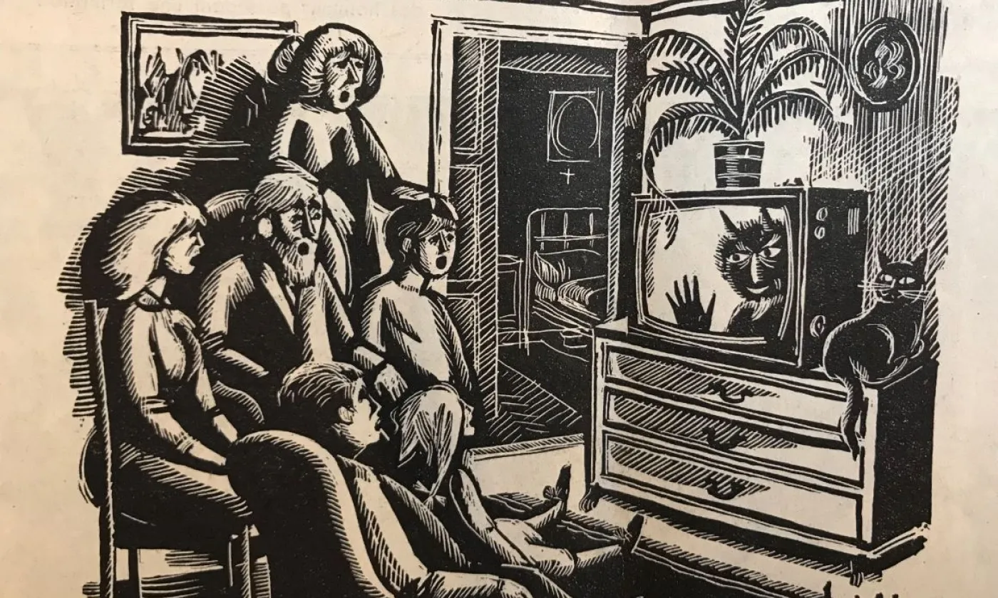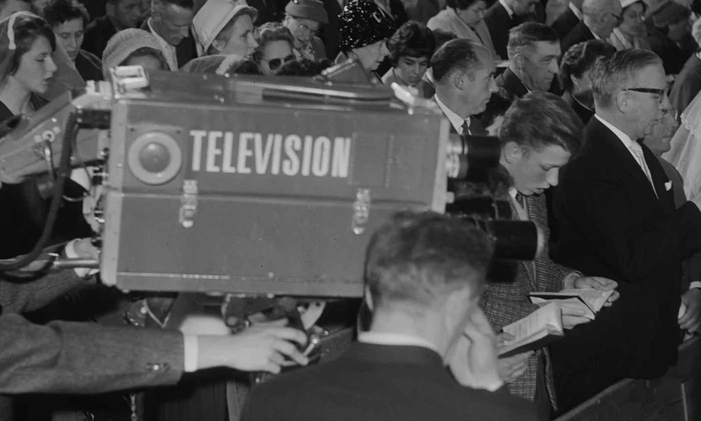 Le rôle de la presse L’Église est présente à la TSR dès 1954 avec des méditations diffusées sous le nom C’est demain dimanche. Suivent les programmes Présence protestante et Présence catholique qui existent, sous d’autres noms, jusqu’aux années 1980. Le 15 mai 1966, l’une d’entre elles est consacrée au rôle de la presse religieuse: un autre média qu’investissent historiquement les Églises. | Un culte télévisé pour les malentendants Le culte trouve également sa place à la télévision, ce qui donne lieu à des expériences originales. Le 2 septembre 1979, une cérémonie conçue par et pour des personnes malentendantes met à profit les possibilités qu’offre l’image télévisuelle: le texte de la prédication apparaît à l’écran et une mise en scène colorée et expressive donne la faveur à la vue plus qu’à l’ouïe. |