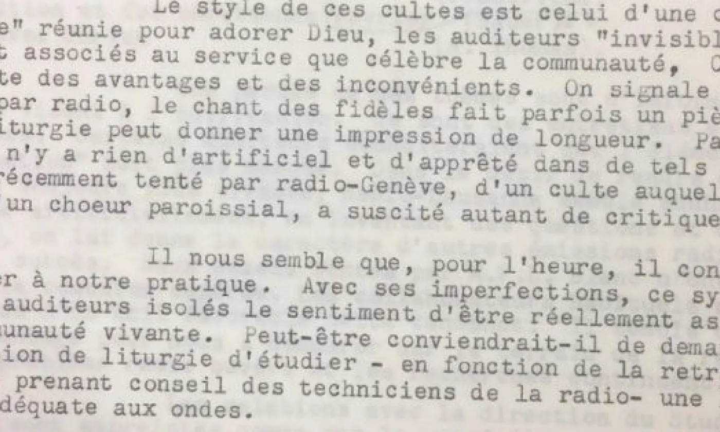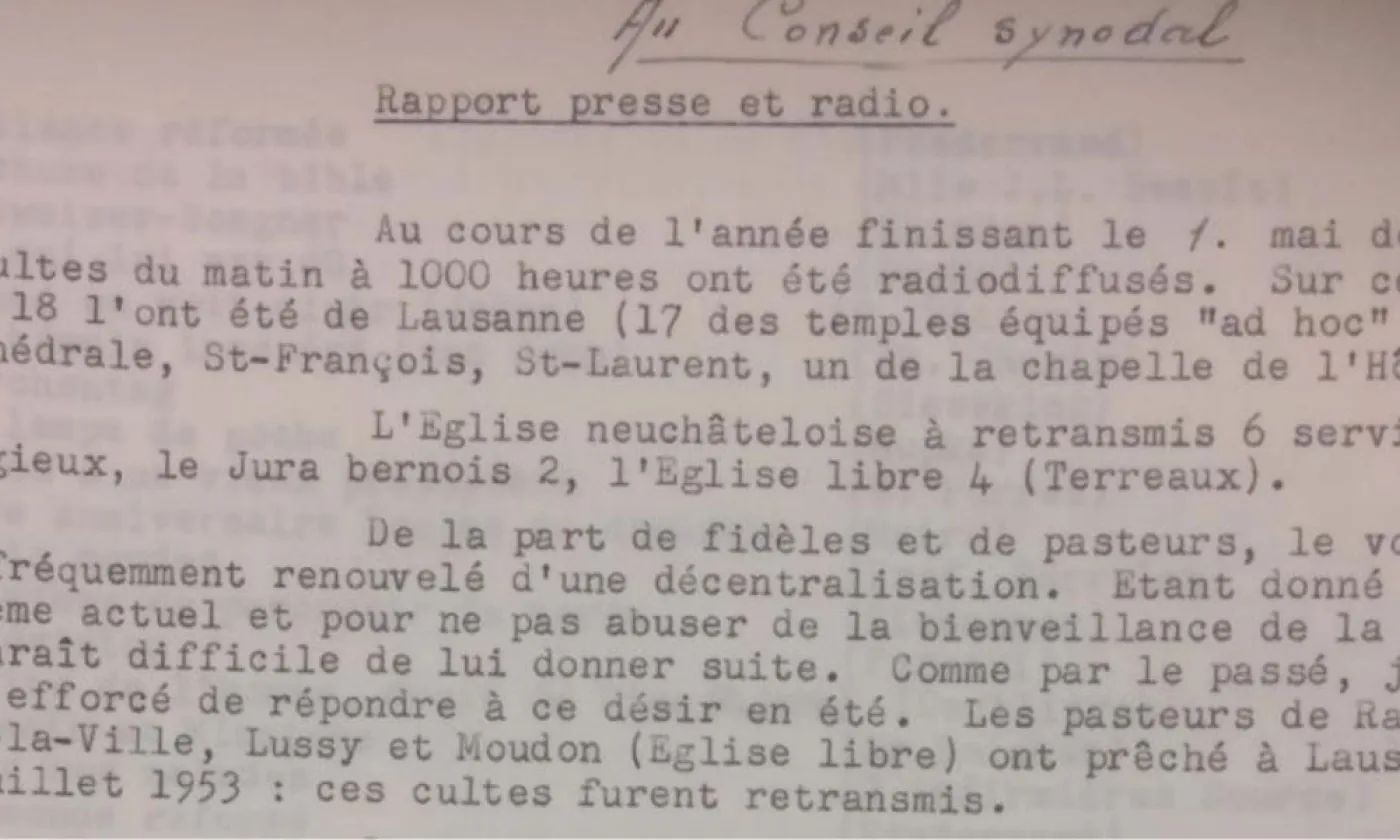 Les cultes radiodiffusés apportent visibilité et prestige aux pasteurs qui officient. Or, pendant longtemps, ils sont le pré carré d’une poignée de paroisses à Lausanne et Genève, ce qui suscite des protestations des autres villes de Suisse romande. Au début des années 1950, un premier assouplissement est acquis: des services religieux sont retransmis hors des deux villes pendant la période estivale. Une autre solution figure dans ce rapport de 1954: inviter des pasteurs à prêcher à Lausanne.