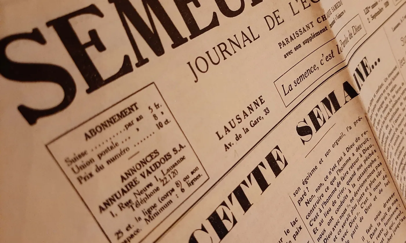«Lundi soir. Une lune splendide joue sur le lac et met une clarté rayonnante de paix sur nos campagnes. Le Conseil fédéral vient d’ordonner la mobilisation des troupes de couvertures de la frontière et de prendre des mesures pour la restriction de la vente de denrées alimentaires. Les Chambres fédérales sont convoquées pour mercredi afin d’élire le général de notre armée. […]», Telles sont les premières lignes de la rubrique «Cette semaine…» en première page du Semeur vaudois — journal de l’Église nationale du 2 septembre 1939, dont un exemplaire m’a été offert cet été lors d’une brocante. Le fascicule de quatre grandes pages dont une entièrement couverte de publicités témoigne de l’anxiété, mais aussi de la confiance en Dieu de ces croyants qui nous ont précédés.