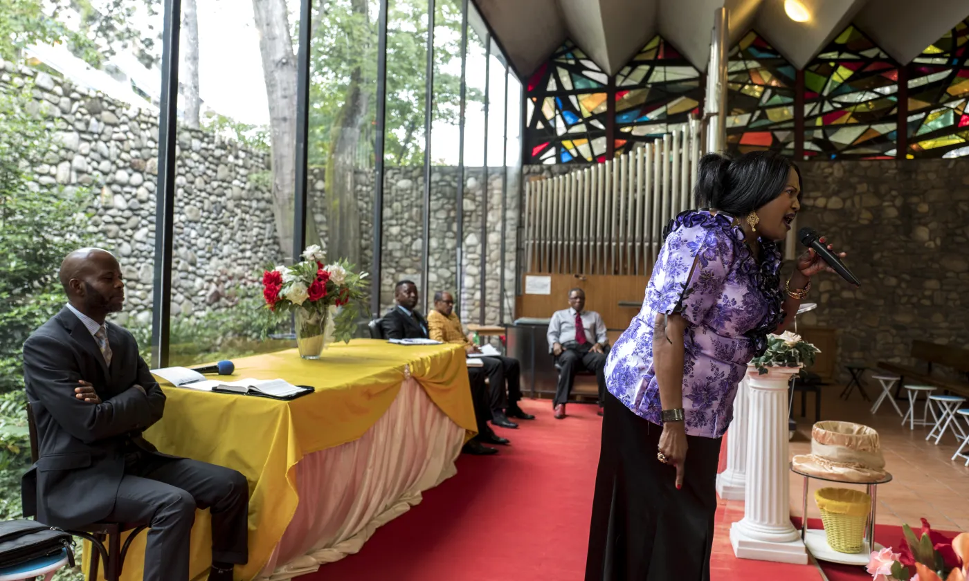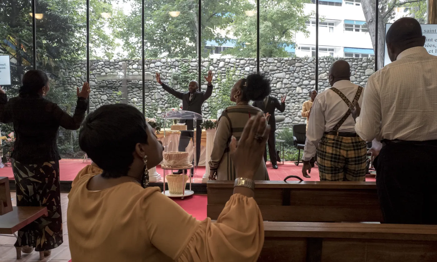 La chorale entraîne l’assemblée dans des chants mêlés de danses durant une heure d’adoration qui ouvre chaque culte dominical.