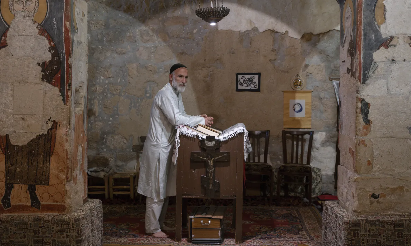 Le père Jihad Youssef, supérieur de la communauté monastique syriaque catholique Al Khalil, devant l'église du monastère de Deir Mar Musa al-Habachi. Mars 2025