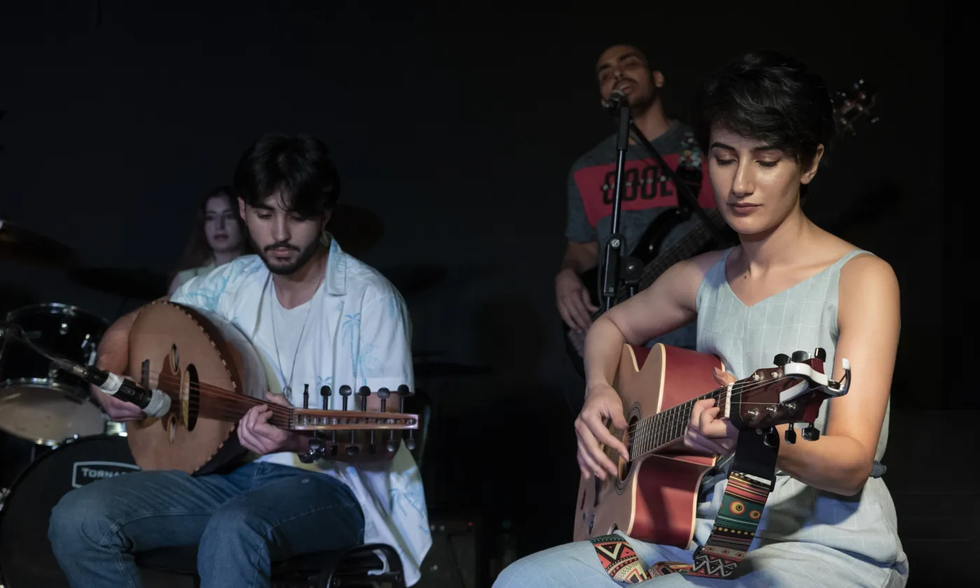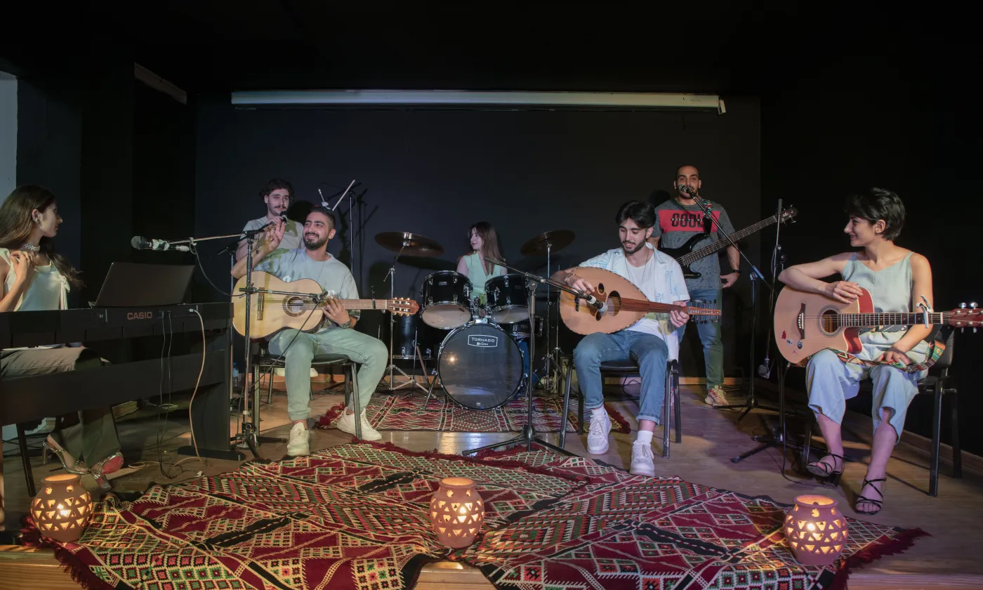 Un groupe de jeunes musiciens fréquentant le centre communautaire jésuite Beit Alberto Hurtado SJ à Jaramana joue lors de la fête de fin d'année organisée par le centre.