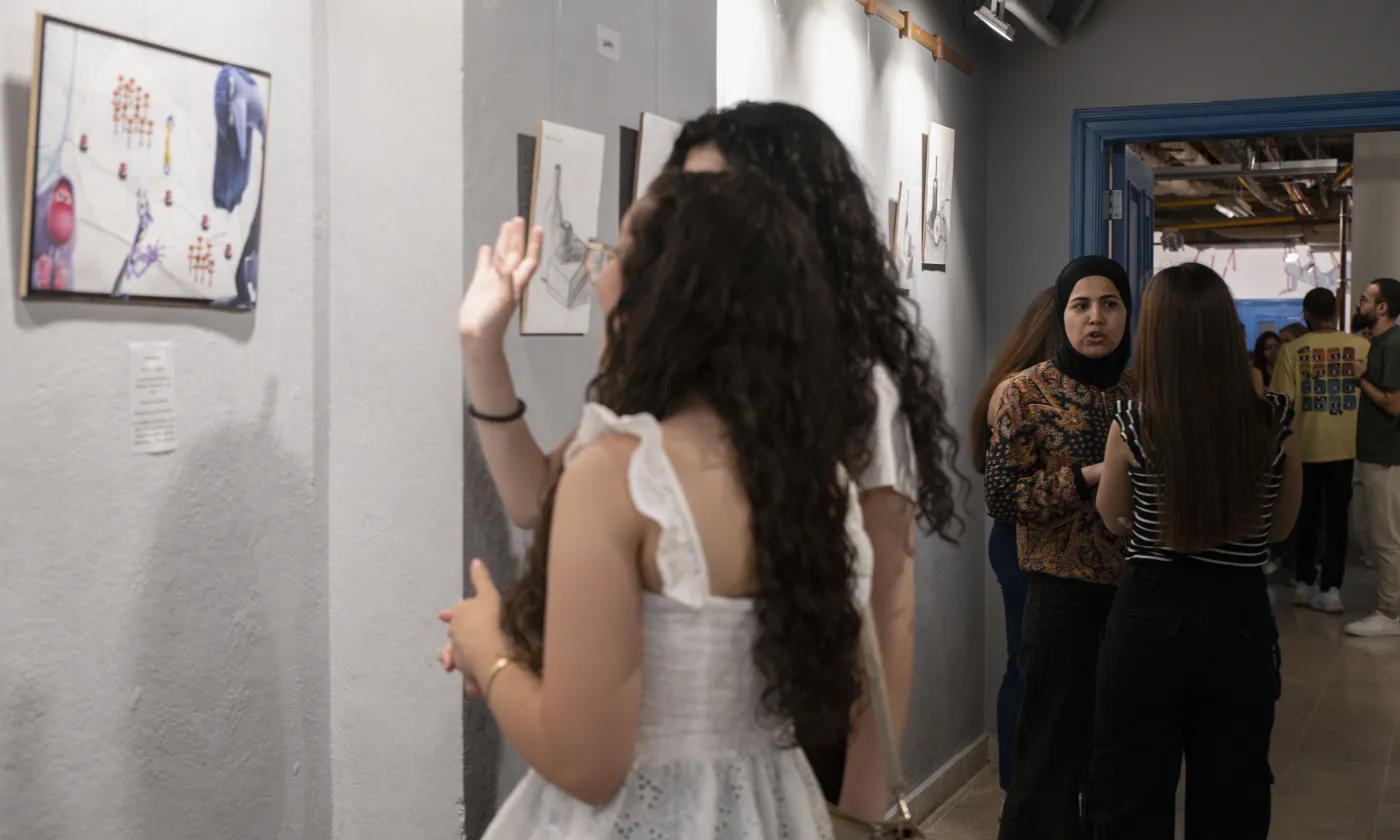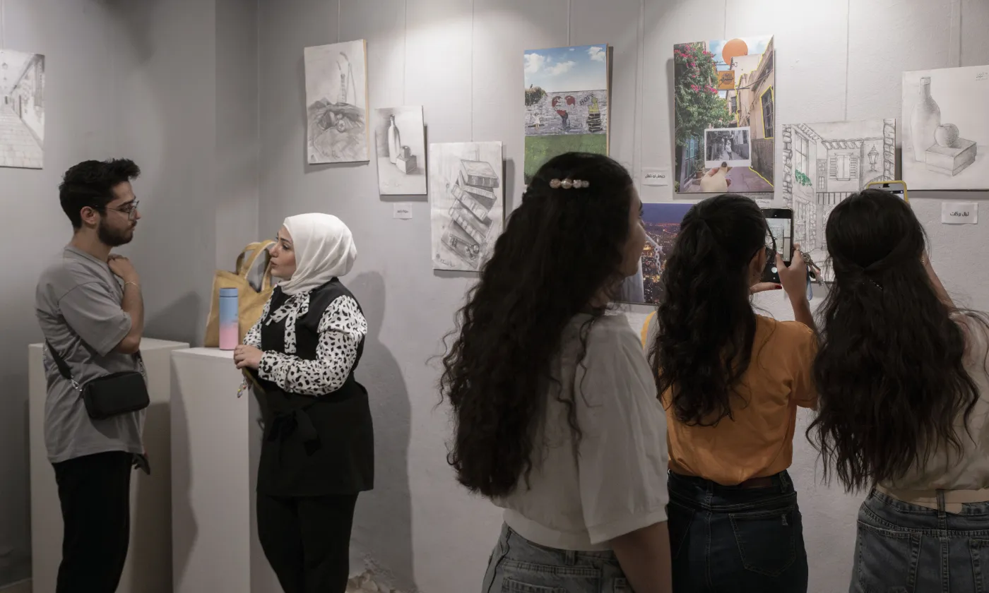 Les jeunes qui fréquentent le centre communautaire jésuite Beit Alberto Hurtado SJ à Jaramana viennent voir une exposition organisée dans le cadre de diverses représentations lors de la fête de fin d'année du centre.