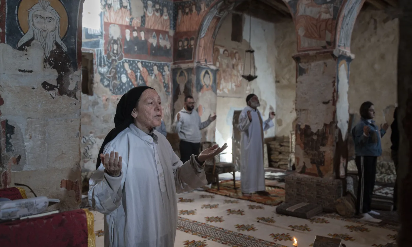 Sœur Houda Fadoul, 61 ans, pendant la prière collective du matin dans l'église du monastère syriaque catholique de Deir Mar Musa al-Habachi. Mars 2025.