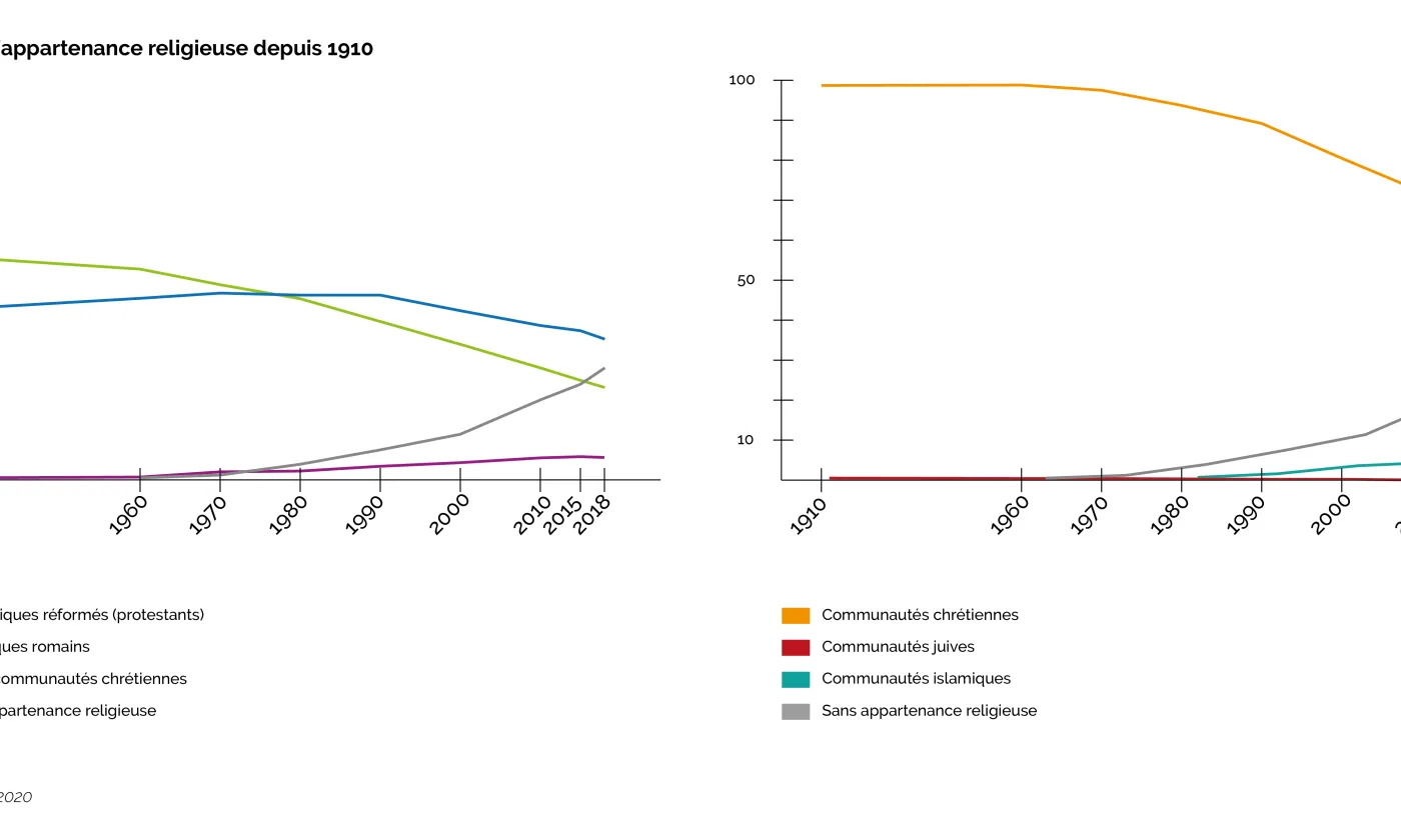 La sécularisation de la Suisse poursuit son chemin. Selon les derniers chiffres recensés par l’Office fédéral de la statistiques, le nombre de personnes sans appartenance religieuse, dans ce pays qui a porté la Réforme protestante, a même devancé la population affiliée à l’Église réformée. Également en perte de vitesse, le catholicisme résiste mieux à cette tendance, en pleine accélération. Par ailleurs, pour la première fois, le nombre de personnes rassemblées sous «autres communautés chrétiennes», subit un léger recul. Faudrait-il y voir un effet de plafond du côté des évangéliques? Décryptage de ces résultats avec le sociologue des religions Christophe Monnot.