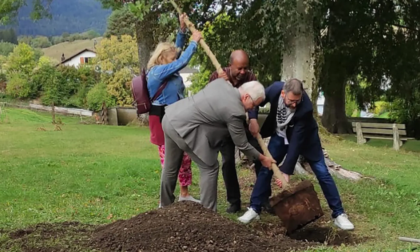 A l’issue du culte de célébration porté par la prédication du pasteur de Haute-Birse Reto Gmünder, lui-même ancien envoyé au Cameroun, les participant·es se sont réunis autour d’un apéritif et du gâteau d’anniversaire. En guise de souvenir et de reconnaissance DM a offert un chêne à la paroisse réformée, ce dernier a été planté dans le magnifique parc de la cure.