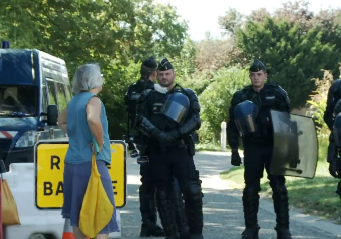 Dans le petit village de Kolbsheim en Alsace, une pasteure harangue les policiers venus évacuer les militants zadistes qui protègent une forêt contre les engins de chantier d’un projet autoroutier.